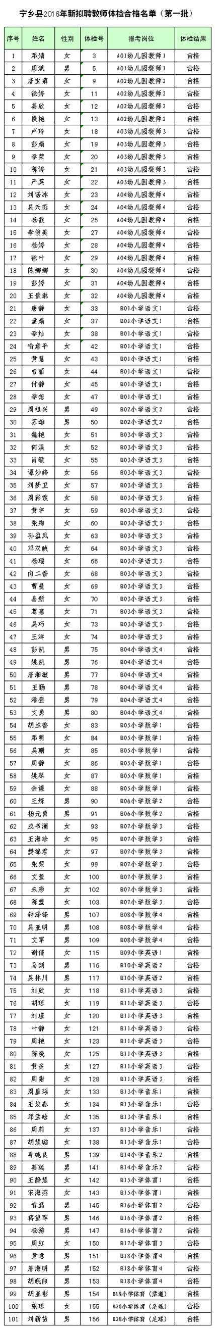 經(jīng)組織體檢,下列人員體檢合格,進(jìn)入考察程序,現(xiàn)予公示。請入圍考察人員于7月5日至7日攜帶本人身份證到寧鄉(xiāng)縣教育局314室辦理調(diào)檔手續(xù)。