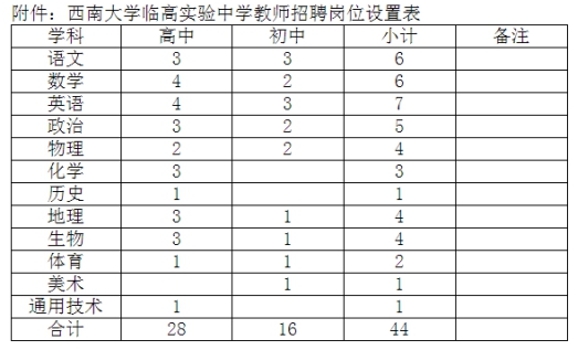 招聘中學各學科新教師共44名(其中:高中教師28名,初中教師16名)。詳細學科分配見附件。