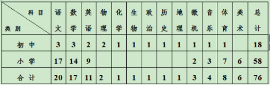 本次擬公開招聘教師共76名:初中18名,小學(xué)58名。具體學(xué)科計劃如下: