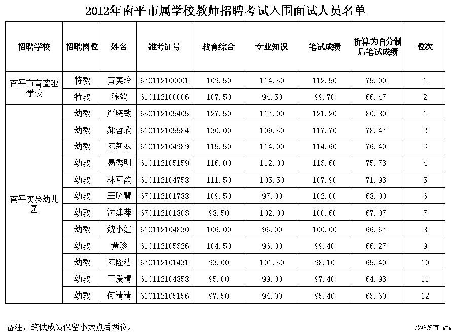 福建省南平市屬五所學(xué)校2012年教師招聘入圍面試人員名單公告