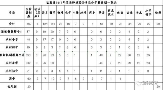 我縣2017年面向社會(huì)公開(kāi)招聘500名中小學(xué)教師,其中高中教師60名、初中教師40名、小學(xué)教師380名、幼兒園教師20名。