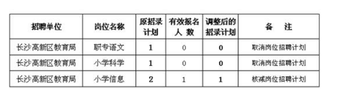 根據(jù)《招聘簡章》的規(guī)定,2017年長沙高新區(qū)公開選聘骨干教師報名已于4月2日結(jié)束,按照《招聘簡章》的要求,共有2個招聘崗位被取消、1個崗位需核減招聘計劃數(shù)(詳見下表),現(xiàn)將應(yīng)核減、取消的招聘崗位公告如下。