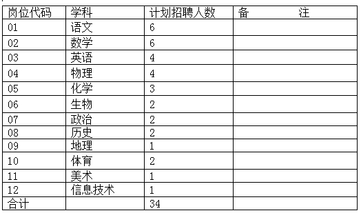 招聘高中教師總計(jì)共34名,各學(xué)科具體分解如下:
