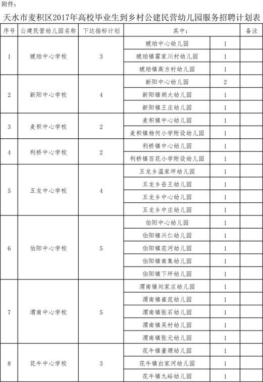 附件:《天水市麥積區(qū)2017年高校畢業(yè)生到鄉(xiāng)村公建民營幼兒園服務(wù)招聘計劃表》