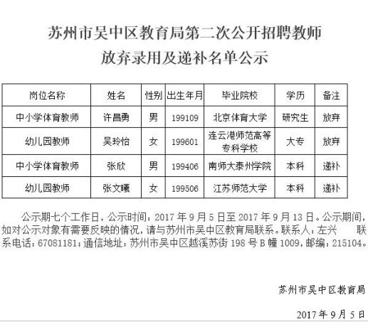 2017年江蘇省蘇州市吳中區(qū)教育局第二次教師招聘放棄錄用及遞補(bǔ)名單公示