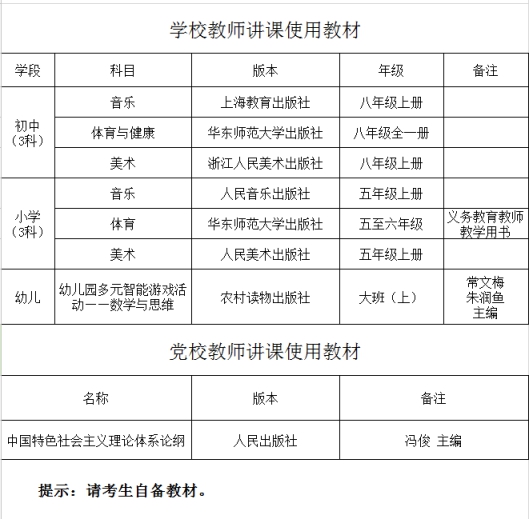 根據(jù)《山西省高平市2017年部分事業(yè)單位公開招聘工作人員的公告》要求,教師崗位(含黨校教師)的面試采取講課方式進(jìn)行,現(xiàn)將講課使用的教材公布如下: