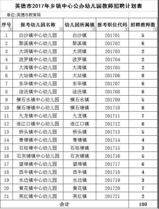 根據(jù)《清遠(yuǎn)市事業(yè)單位公開(kāi)招聘人員辦法》(清府〔2011〕83號(hào))、英德市機(jī)構(gòu)編制委員會(huì)《關(guān)于同意增加鄉(xiāng)鎮(zhèn)中心幼兒園政府購(gòu)買服務(wù)人員數(shù)的批復(fù)》(英編辦〔2017〕49號(hào))精神,我市決定向社會(huì)公開(kāi)招聘公辦幼兒園教師共100名(詳見(jiàn)附件1),F(xiàn)將有關(guān)事項(xiàng)公告如下
