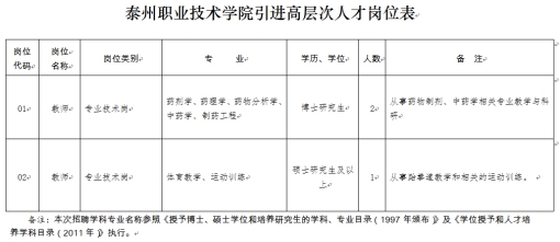 為加強(qiáng)師資隊(duì)伍建設(shè),更好地提高人才培養(yǎng)質(zhì)量與教學(xué)水平,根據(jù)《泰州市市屬事業(yè)單位高層次人才引進(jìn)辦法(試行)》(泰人社發(fā)〔2016〕48號(hào))精神,經(jīng)泰州市人力資源和社會(huì)保障局核準(zhǔn),泰州職業(yè)技術(shù)學(xué)院決定面向市外引進(jìn)部分高層次人才,F(xiàn)將有關(guān)事項(xiàng)公告如下: