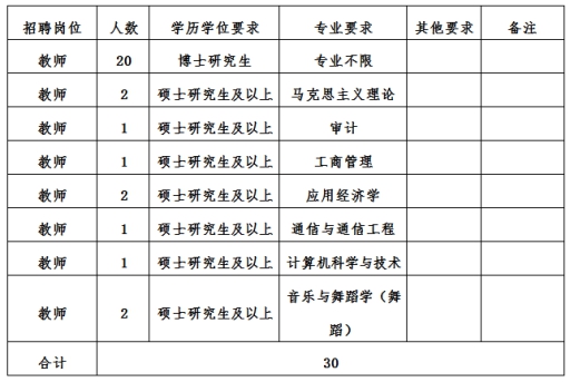 招聘崗位為教師崗位,招聘計劃30名。具體招聘崗位及相關資格條件見《2018年專項招聘工作人員計劃表》(附件)。