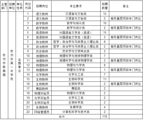 按照中共山西省委組織部、山西省人力資源和社會保障廳《關于進一步改進和加強事業(yè)單位公開招聘工作的意見》(晉人社廳發(fā)〔2017〕35號)和《關于做好2017年全省事業(yè)單位公開招聘人員工作的通知》(晉人社廳發(fā)〔2017〕37號)等文件精神,根據(jù)招聘計劃和招聘單位編制、崗位空缺情況,經(jīng)市政府研究決定,擬為忻州市第一中學招聘教師110名。現(xiàn)公告如下: