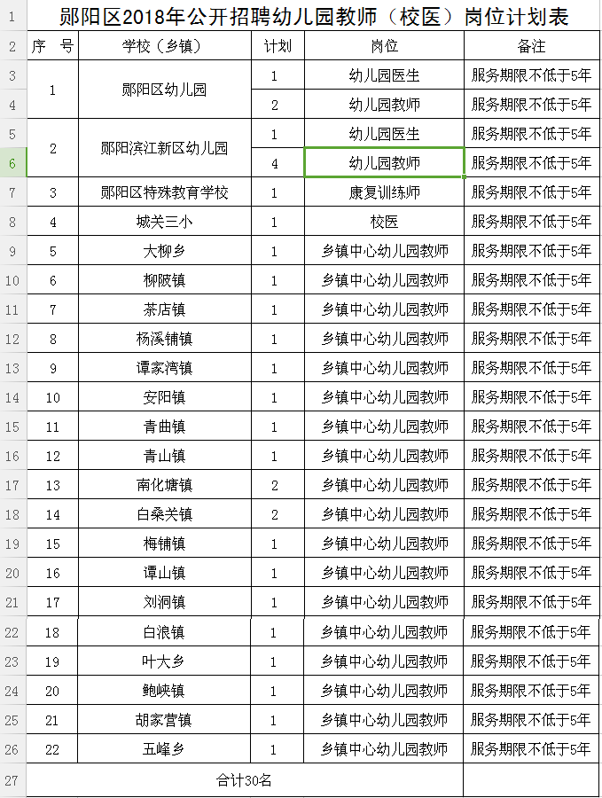鄖陽區(qū)2018年面向社會公開招聘幼兒園教師(校醫(yī))58名,其中教學(xué)點村小學(xué)前教育教師28名,鄉(xiāng)鎮(zhèn)中心幼兒園教師20名,城區(qū)幼兒園教師6名,校醫(yī)4名(含區(qū)特?祻(fù)教師1名)。具體招聘崗位計劃表見附件1(2018年教學(xué)點村小學(xué)前教育教師招聘崗位計劃)和附件2(2018年鄉(xiāng)鎮(zhèn)、城區(qū)幼兒園教師校醫(yī)招聘崗位計劃)。