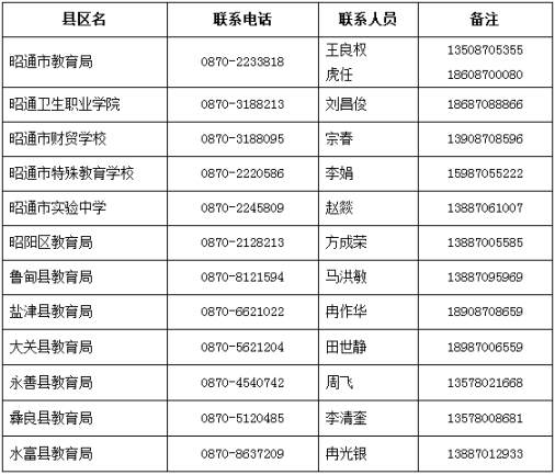 (2)各縣區(qū)和市直各學校其他現(xiàn)場報名具體時間及地點以縣區(qū)教育局和市直學校發(fā)布的相關信息為準。聯(lián)系方式詳見《昭通市2018年第二批公開招聘優(yōu)秀緊缺專業(yè)教師各單位聯(lián)系方式》(附件4)。