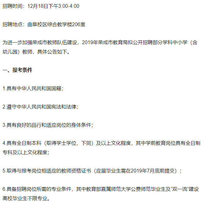 1.教育部直屬師范大學(xué)2019屆山東省生源公費師范畢業(yè)生和符合跨省就業(yè)規(guī)定的外省生源公費師范畢業(yè)生,經(jīng)面試、考察合格,可以在榮成市教育局轄屬中小學(xué)校自主選擇工作單位。