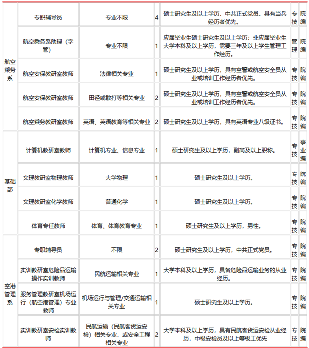 為進(jìn)一步深化干部人事制度改革,拓寬選人用人視野,根據(jù)國家及民航局有關(guān)事業(yè)單位公開招聘人員的相關(guān)規(guī)定,按照公開、平等、競爭、擇優(yōu)的原則,現(xiàn)面向社會(huì)公開招聘教職員工45名,現(xiàn)將相關(guān)事宜公告如下。