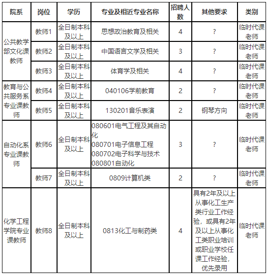 山東化工技師學院兼職代課教師招聘公告【24人】