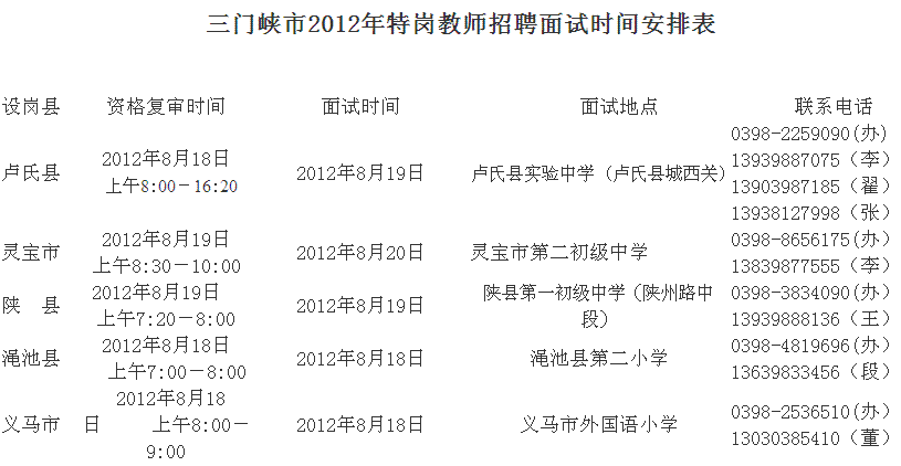 河南省三門峽市2012年特崗教師招聘面試時(shí)間安排表