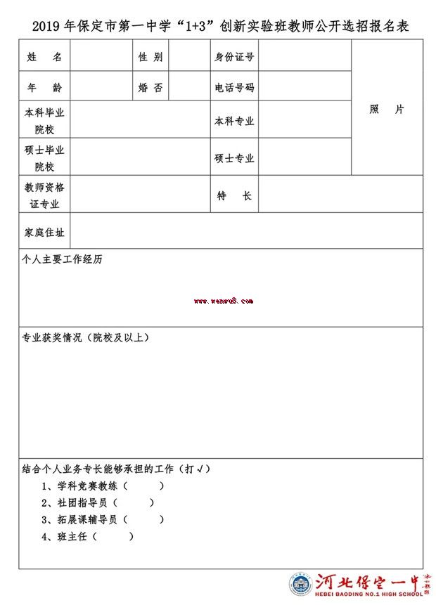2、報(bào)名要求:報(bào)名者須提供身份證、畢業(yè)證、教師資格證、普通話等級證等職位要求的相關(guān)證件原件及復(fù)印件各一份,近期正面免冠彩色小2寸照片2張。填寫《2019年保定市第一中學(xué)“1+3”實(shí)驗(yàn)班教師公開選招報(bào)名表》(報(bào)名表可從保定市第一中學(xué)網(wǎng)站www.bdyz1.cn下載,提前填好)一式兩份。報(bào)到試講時(shí),繳納報(bào)名費(fèi)50元。