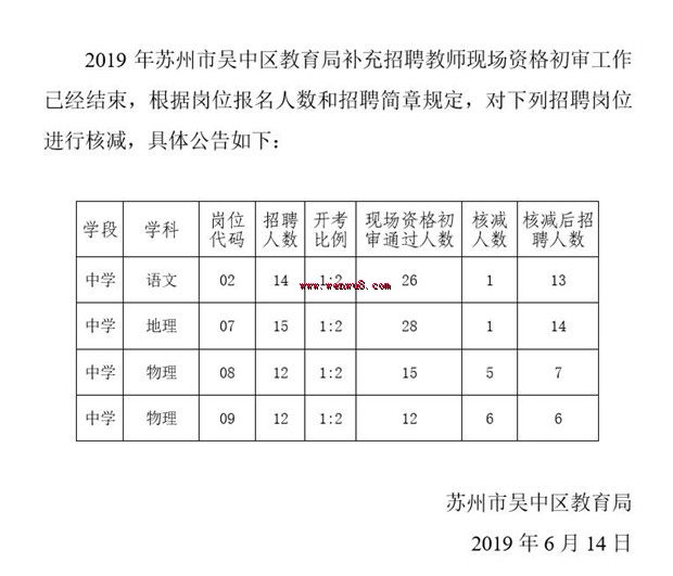 2019年蘇州市吳中區(qū)教育局補(bǔ)充招聘教師崗位核減公告 |