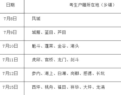 報(bào)名時(shí)間:7月8日至7月15日(工作日,上午8:00—12:00,下午3:00—6:00),逾期概不受理。為避免考生報(bào)名時(shí)扎堆,保證報(bào)名工作有序進(jìn)行,現(xiàn)場報(bào)名時(shí)間按考生的戶籍所在地(鄉(xiāng)鎮(zhèn))安排,具體如下: