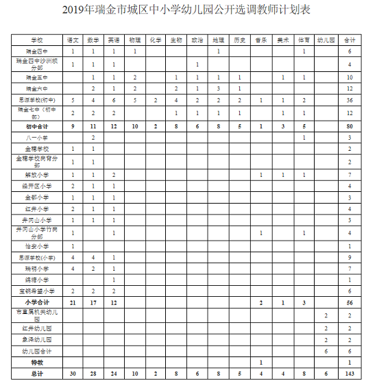 2019江西贛州瑞金教師招聘 城區(qū)中小學幼兒園選調(diào)教師工作方案【143名】
