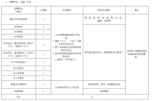 根據(jù)磐安縣教育事業(yè)發(fā)展和教師隊(duì)伍建設(shè)需要,決定面向全國公開招聘31名編內(nèi)教師。具體公告如下: