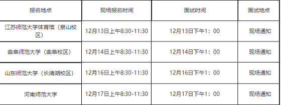 本次招聘在江蘇師范大學(xué)、曲阜師范大學(xué)、山東師范大學(xué)、河南師范大學(xué)等地設(shè)招聘點(diǎn),采取現(xiàn)場(chǎng)報(bào)名面試的方式進(jìn)行。2019年12月13日開(kāi)始根據(jù)招聘崗位空缺情況依次到各招聘點(diǎn)分別舉行專場(chǎng)招聘會(huì),我局將會(huì)及時(shí)通知網(wǎng)上報(bào)名人員到就近招聘點(diǎn)參加面試。