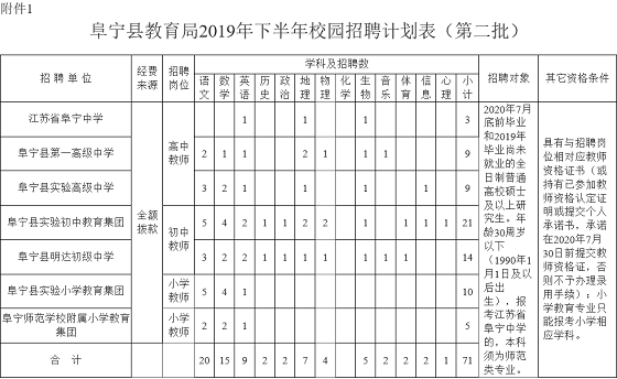 1.阜寧縣教育局2019年下半年校園招聘教師崗位表