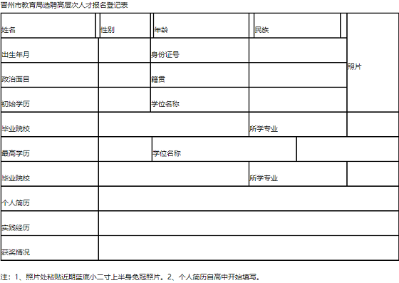 方法及要求:采取到教育局人事科報名方式進行。報名人員須提交居民身份證、教師資格證書、第一學歷及最高學歷畢業(yè)證、學位證、學信網(wǎng)下載打印最高學歷《學歷證書電子注冊備案表》、教育部留學服務中心出具的國外學歷學位證書等有效證件原件及復印件1份,近期1寸免冠正面彩色同版照片4張(附電子版),《晉州市教育局選聘高層次人才報名登記表》一式三份。