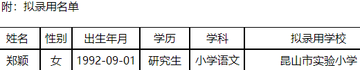 根據(jù)《2019年昆山市教育系統(tǒng)公開招聘中小學教師簡章》,鄭穎(人員信息附后)已通過昆山市教育局組織的筆試、面試、體檢(因懷孕緩檢)和考察,現(xiàn)進行錄用公示,公示時間為2020年1月7日~2020年1月16日。如對公示對象有異議,可在公示期間向昆山市教育局反映,聯(lián)系電話:57514790。