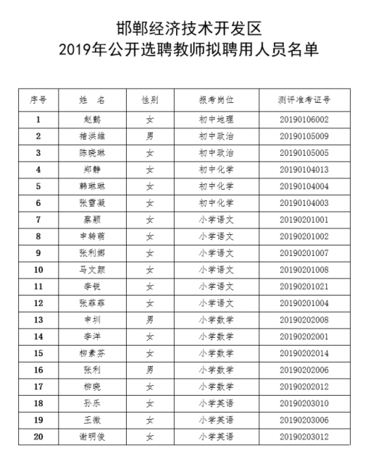 河北邯鄲經濟技術開發(fā)區(qū)2019年公開選聘教師擬聘用人員公示