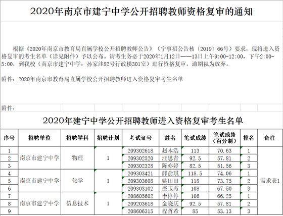 2020年江蘇教師招聘 南京市建寧中學(xué)公開招聘教師資格復(fù)審的通知