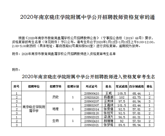 2020年南京曉莊學院附屬中學公開招聘教師進入資格復審考生名單