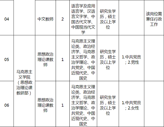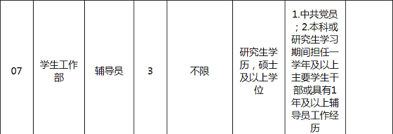 (注:崗位代碼07崗位要求主要學(xué)生干部指校、院學(xué)生會或研究生會主席、副主席,校、院團(tuán)委副書記或團(tuán)總支書記,校、院團(tuán)委或?qū)W生會或研究生會副部長及以上;校、院學(xué)生社團(tuán)聯(lián)合會主席、副主席,校、院學(xué)生自律委員會主任、副主任,校、院大學(xué)生藝術(shù)團(tuán)團(tuán)長、副團(tuán)長;正副班長、正副團(tuán)支部書記;正副學(xué)生黨支部書記;校易班學(xué)生工作站站長、副站長、部長;校電臺臺長,校報記者團(tuán)團(tuán)長,校級團(tuán)學(xué)組織主要刊物主編及以上職務(wù),或研究生期間擔(dān)任班委。取得境外學(xué)歷學(xué)位報考者不作學(xué)生干部經(jīng)歷或輔導(dǎo)員工作經(jīng)歷要求。)