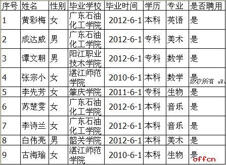 附件:2012年高州市公開招聘中小學(xué)教師擬補錄人員名單