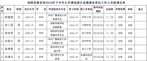 四川廣元劍閣縣2019年下半年公開遴選部分直屬事業(yè)單位工作人員擬調(diào)公示