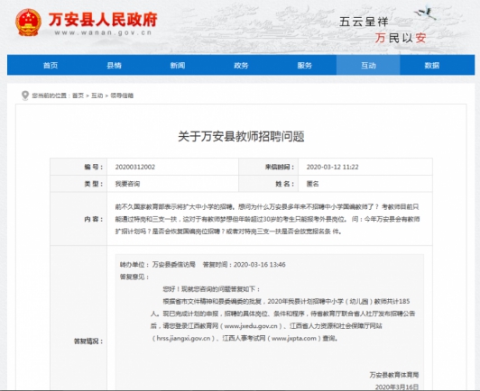 根據(jù)省市文件精神和縣委編委的批復,2020年我縣計劃招聘中小學(幼兒園)教師共計185人,F(xiàn)已完成計劃的申報,招聘的具體崗位、條件和程序,待省教育廳聯(lián)合省人社廳發(fā)布招聘公告后,請您登錄江西教育網(wǎng)(www.jxedu.gov.cn)、江西省人力資源和社會保障廳網(wǎng)站(hrss.jiangxi.gov.cn)、江西人事考試網(wǎng)(www.jxpta.com)查詢。
