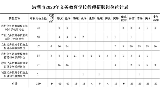 2020年,洪湖市根據(jù)教育發(fā)展需要,將公開招聘各類教師350名。其中:義務(wù)教育學(xué)校教師260名(農(nóng)村學(xué)校200名、城區(qū)學(xué)校60名),非義務(wù)教育學(xué)校教師90名(高中28名、中職15名、公辦幼兒園45名、特校2名)。