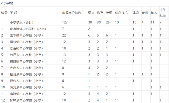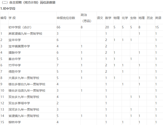 竹山縣2020年義務(wù)教育學(xué)校公開招聘教師211名。含:新機(jī)制教師18名(初中語文18名);自主招聘教師(地方計(jì)劃)193名,其中:初中學(xué)段66名(數(shù)學(xué)20名、英語15名、政治8名、物理5名、化學(xué)5名、生物5名、地理8名),小學(xué)學(xué)段127名(語文30名、數(shù)學(xué)30名、英語25名、信息技術(shù)10名、體育10名、音樂4名、美術(shù)11名、科學(xué)7名)。具體崗位如下: