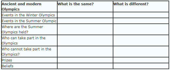 班級(jí)活動(dòng):學(xué)生按上表的提示用自己的語(yǔ)言分別描述古代與現(xiàn)代奧運(yùn)會(huì),加深對(duì)課文的理解。