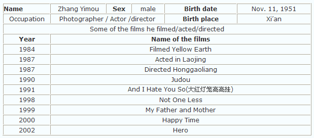 1. Try to find information about Zhang Yimou and fill in the table before class.