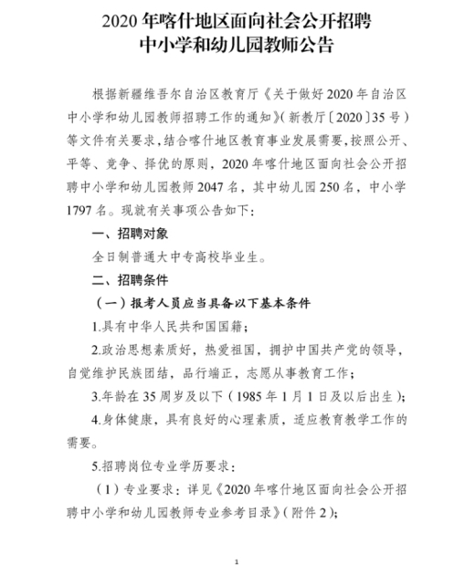 2020年新疆喀什地區(qū)面向社會公開招聘中小學(xué)和幼兒園教師公告【2047人】
