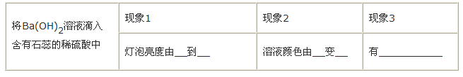 任務(wù)一:【實(shí)驗(yàn)探究】先向Ba(OH)2溶液中加入酚酞溶液,接著按P43圖2-2-8所示裝置連接,然后向Ba(OH)2溶液中滴加稀硫酸(指導(dǎo)學(xué)生邊觀察實(shí)驗(yàn)邊做好下表實(shí)驗(yàn)記錄)。