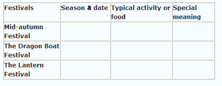 Read the article again. Write an article about one of the Chinese seasonal festival.