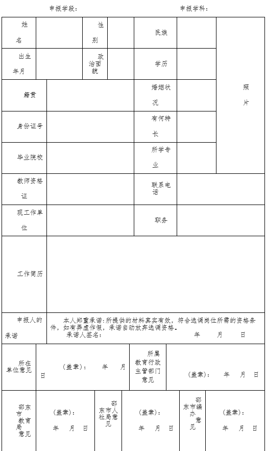 2、本表一式一份,現(xiàn)場資格審查時交邵東市教育局。