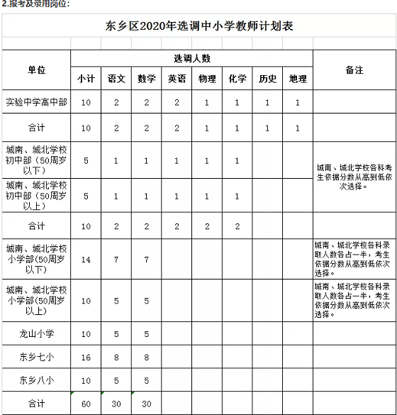 (2)面向除城區(qū)一小、二小、實(shí)驗(yàn)小學(xué)、北港小學(xué)、荊公小學(xué)、龍山小學(xué)和三中小學(xué)部、東鄉(xiāng)四中小學(xué)部、東鄉(xiāng)五中小學(xué)部、東鄉(xiāng)八小及幼兒園(含三定向幼師畢業(yè)定向在農(nóng)村學(xué)校的幼師畢業(yè)生)以外的小學(xué)選調(diào)50周歲以下教師50人(語(yǔ)文25名、數(shù)學(xué)25名);50周歲以上教師10人(語(yǔ)文5名、數(shù)學(xué)5名),僅限報(bào)考城南、城北學(xué)校小學(xué)部。