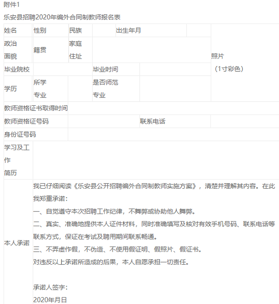 附件:1.樂安縣招聘2020年編外合同制教師報名表