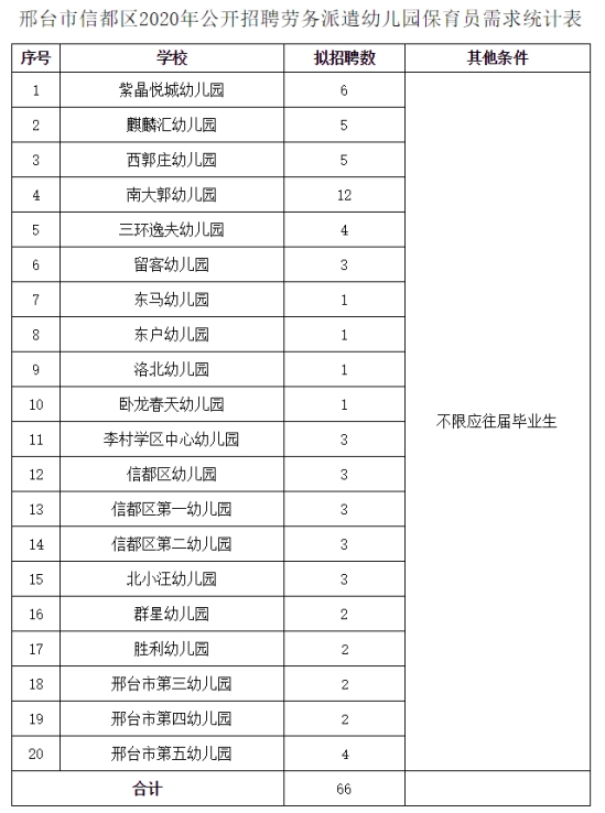具體招聘人數(shù)和崗位條件詳見《邢臺(tái)市信都區(qū)2020年公開招聘勞務(wù)派遣幼兒園保育員崗位信息表》(附件1)及《邢臺(tái)市信都區(qū)2020年公開招聘勞務(wù)派遣幼兒園保育員需求統(tǒng)計(jì)表》(附件2)。