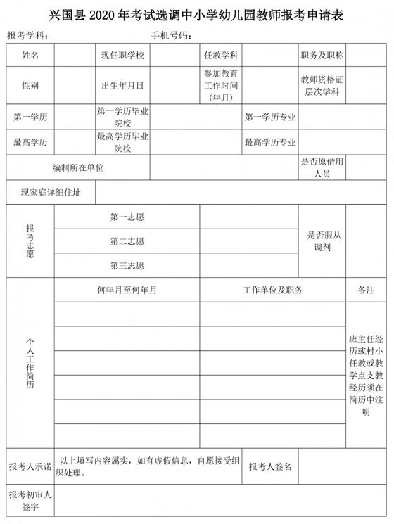 附件1:興國(guó)縣2020年考試選調(diào)中小學(xué)幼兒園教師報(bào)考申請(qǐng)表