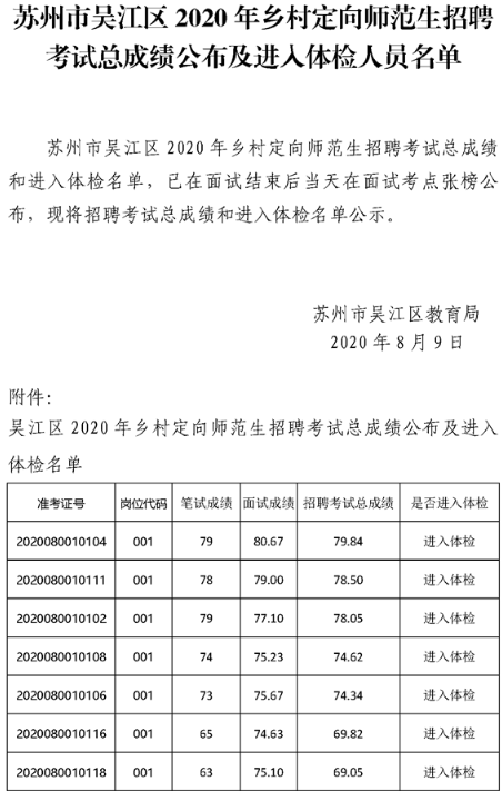 2020年蘇州教師招聘 蘇州市吳江區(qū)鄉(xiāng)村定向師范生招聘考試總成績公布及進(jìn)入體檢人員名單