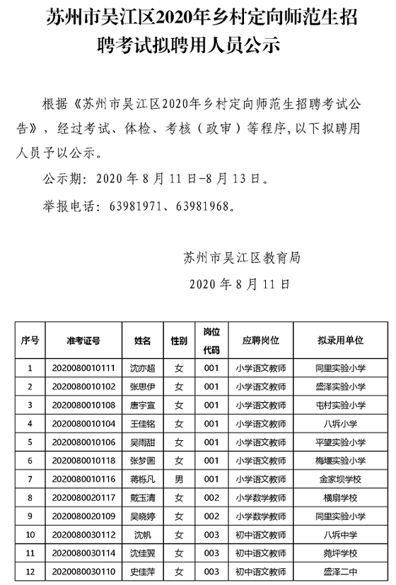 2020年蘇州教師招聘 蘇州市吳江區(qū)鄉(xiāng)村定向師范生招聘考試擬聘用人員公示